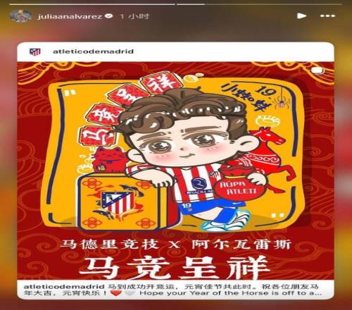 随后,阿尔瓦雷斯转发了自己的海报,在这幅海报中有他的动画形象,祝福语是:“马竞呈祥”。